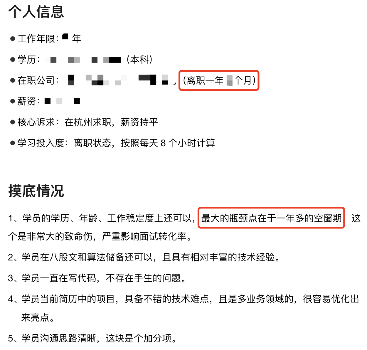 - 项目技术辅导: 根据最终简历梳理出项目和技术面试问题,并对他进行辅导答疑,直到消化简历内容为止。